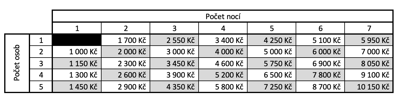 Ceny v tabulce jsou ceny za chatku dle počtu osob a nocí. V ceně ubytování je zahrnuto:
